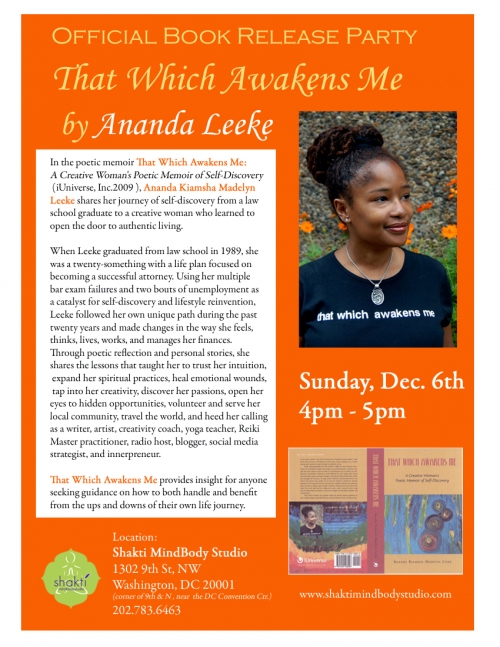 PS: If you are in the D.C. area on December 6, please join me for my official book release party at SHAKTI MindBody Studio. See the flyer below.