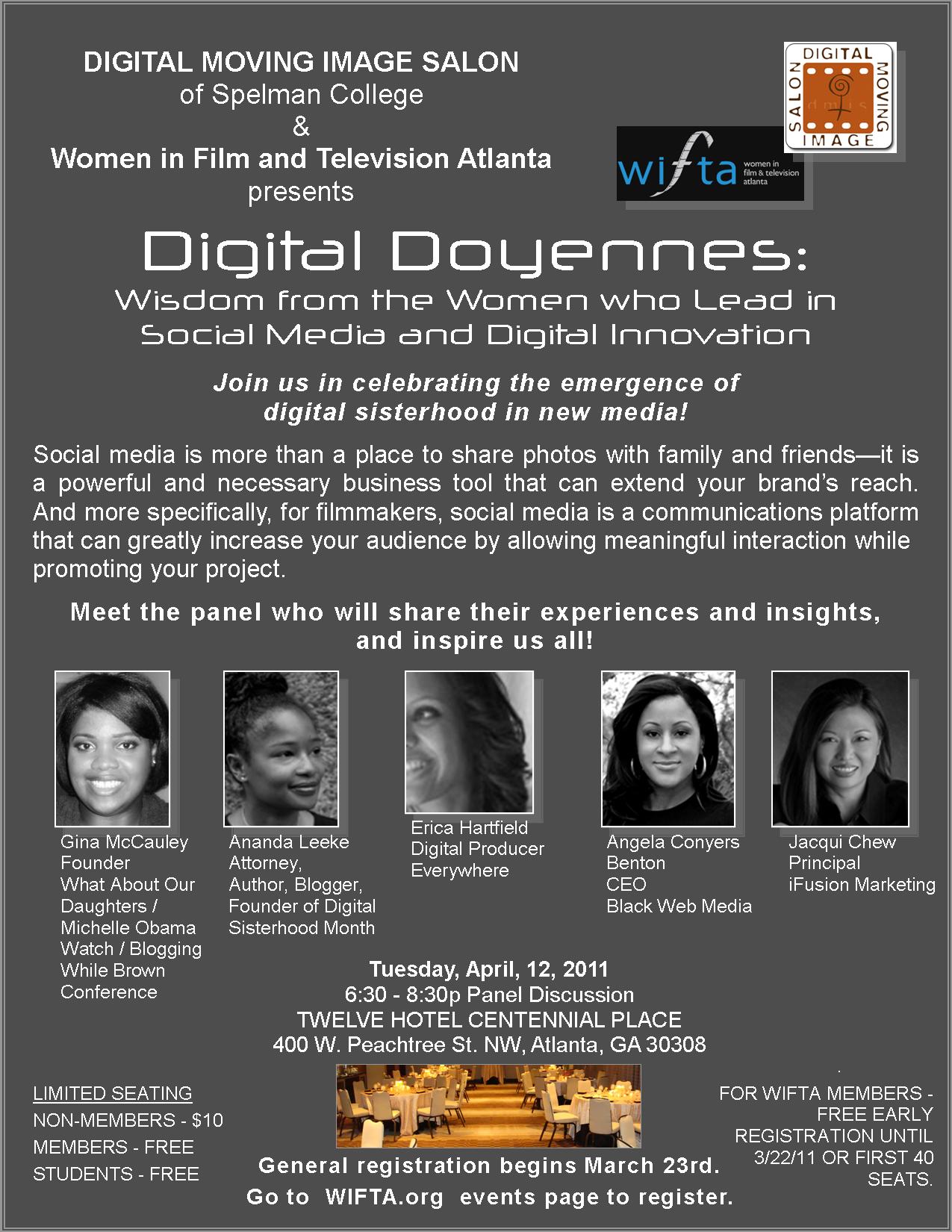 While I am in Atlanta, I will get to see my attorney, best friend, and Howard University School of Law classmate Lauren Medlock Smith, founder of Catch the Verve, LLC.  Lauren is currently serving as the sponsorship chair for Women in Film & Television Atlanta, a co-sponsor of the Digital Doyennes event.