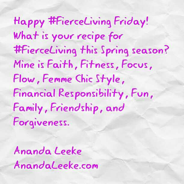 Happy #FierceLiving Ftidsy! Do you have a Spring recipe for #FierceLiving? What are your key ingredients? Check out mine below. Rate this:Share this: Click to print (Opens in new window) Print Click to share on Facebook (Opens in new window) Facebook Click to share on X (Opens in new window) X Click to share on Reddit (Opens in new window) Reddit Click to email a link to a friend (Opens in new window) Email Click to share on Pinterest (Opens in new window) Pinterest Click to share on LinkedIn (Opens in new window) LinkedIn Click to share on Tumblr (Opens in new window) Tumblr Like Loading... Related