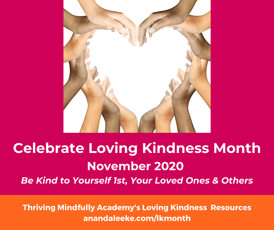 2020 has been a year like no other. So many things have happened to us as a result of the COVID-19 pandemic, economic instability, divisive politics, fake news, and the constant acts of injustice, oppression, and violence against indigenous and people of color, women, children, the elderly, the disabled, and LGBTQ communities. In an effort to provide support to everyone, I am using the Thriving Mindfully Academy’s platform to launch Loving Kindness Month this month to remind us all of the power we have to slow down and take better care of ourselves with gentleness and nonjudgment.
