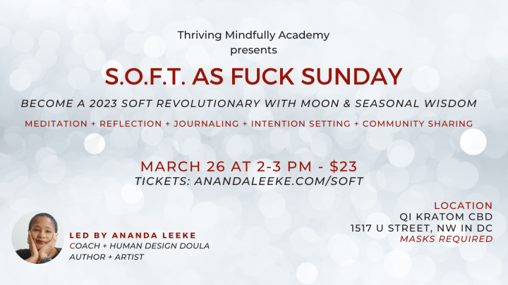 If you’re interested, click the button below to register for the S.O.F.T. AF Sunday on March 26th at 2-3 PM at Qi Kratom CBD Tea, 1517 U Street, NW, in DC.