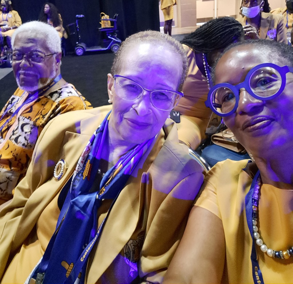 My favorite SGRho memories with her include the day she pinned me during my Beta Tau Chapter induction ceremony in 1983; traveling with her to my first Boule as a soror in 1984; watching her get pinned as a Cultured Pearl in 2010; witnessing her receive Butler University’s special recognition of her service as a Cultured Pearl and an educator during the Centennial Founders’ Day weekend in 2022 (see first photo at the top of the post); and attending the Centennial Boule with her and my dad in Indianapolis in 2022 (photo above).