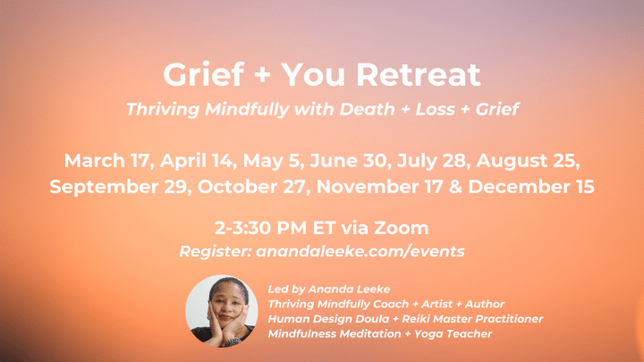 If you’re struggling with or interested in exploring how to embrace Thriving Mindfully with death, loss, and grief, join me for the 2024 Grief and You Retreat Series on March 17, April 14, May 5, June 30m July 28, August 25, September 29, October 27, November 17, and December 15 at 2-3:30 PM ET via Zoom. Click the REGISTER button below.