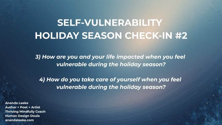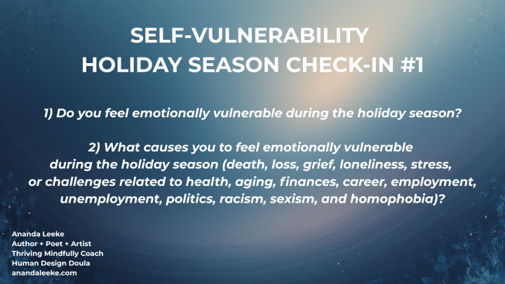 If you are feeling vulnerable and/or experiencing grief during the holidays, I invite you to use my holiday check-in list of questions to get in touch with yourself below.