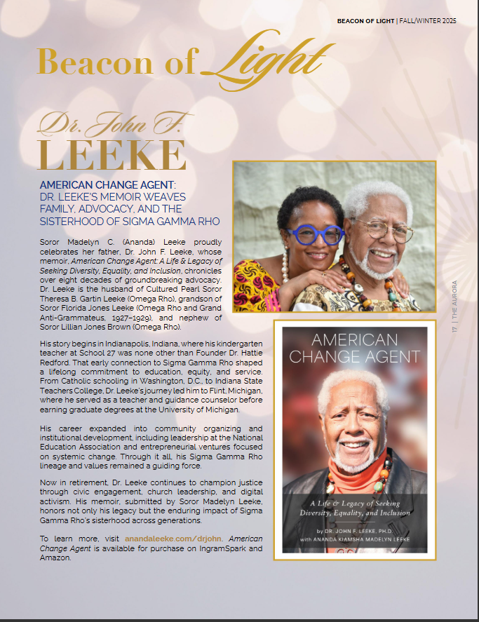 Special thanks to my amazing Sorors of Sigma Gamma Rho Sorority, Inc. for featuring American Change Agent: A Life & Legacy of Seeking Diversity, Equality, and Inclusion, the book my dad Dr. John F. Leeke and I wrote about his life and work, in the Fall/Winter issue of The Aurora Magazine.