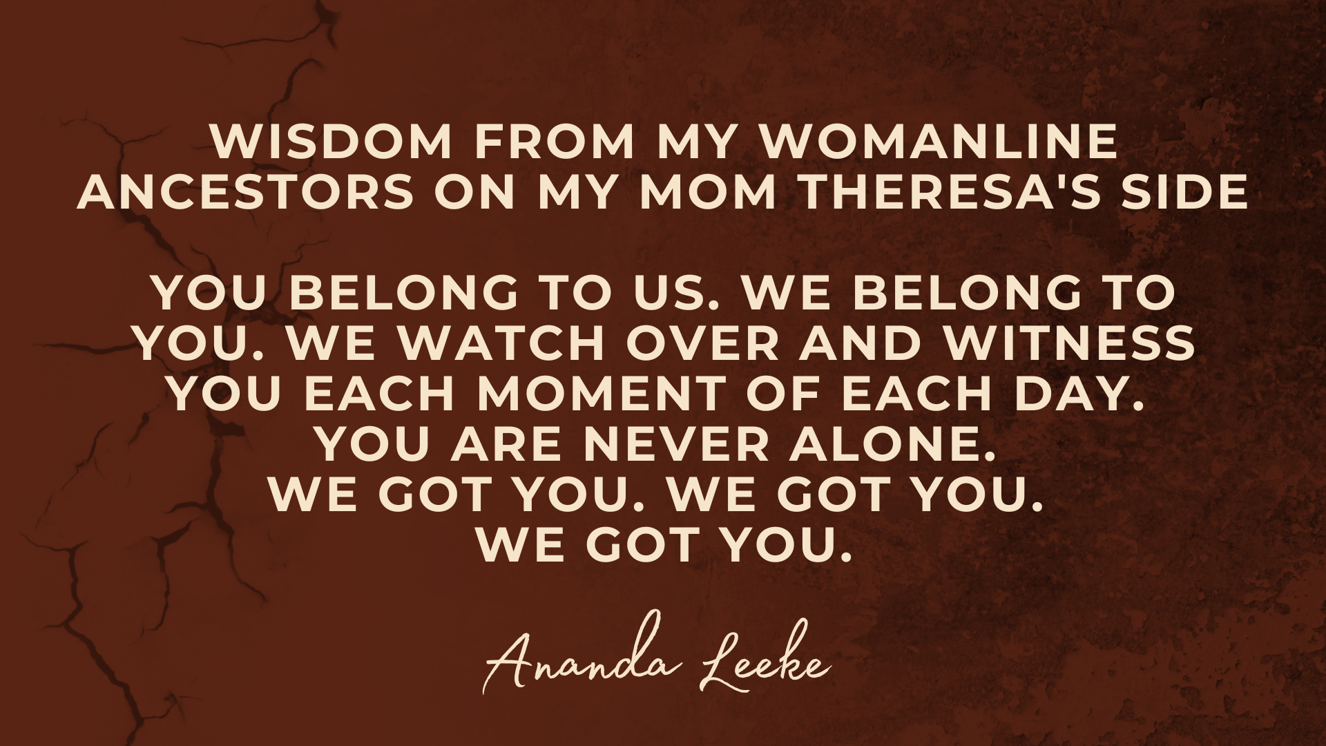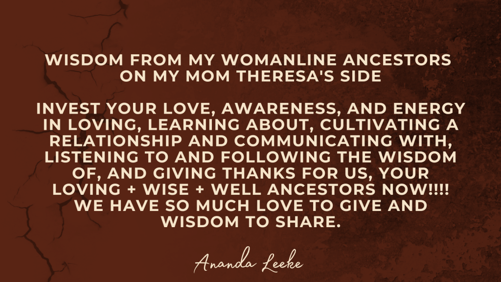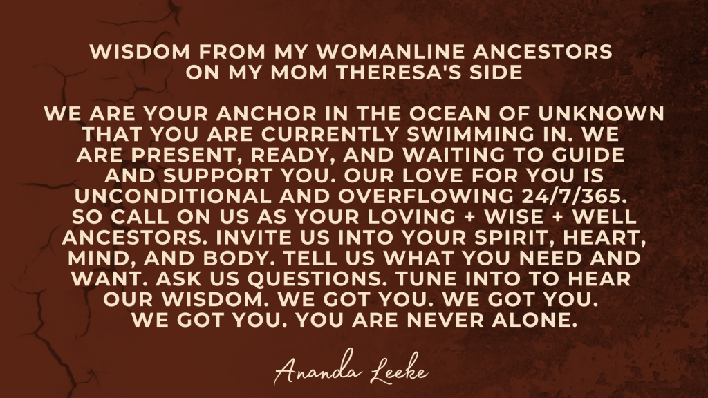 This winter, I have been spending time deepening my connection to and cultivating my relationships with “womanline” ancestors on my mother Theresa’s side. They remind me to take care of myself. Their wisdom is guiding me as I navigate several experiences that I am choosing to label “THE UNKNOWN.” They are a wellness lifeline. Check out their wisdom below.