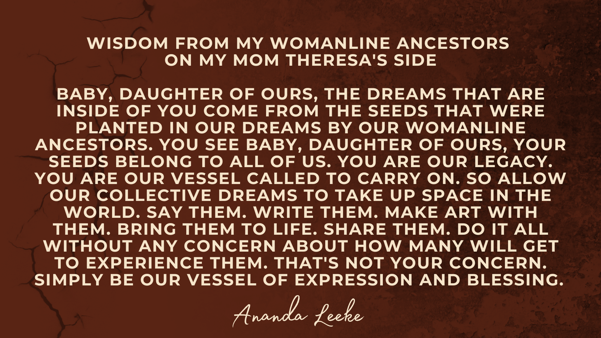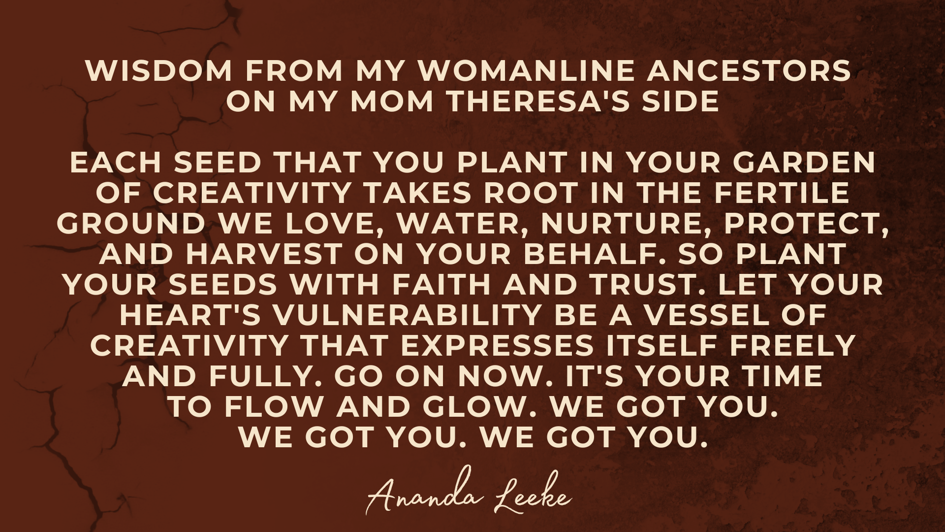 3) Our Seeds of Creativity Are Planted in Fertile Ground Loved, Watered, Nurtured, Protected, and Harvested by Our Ancestors