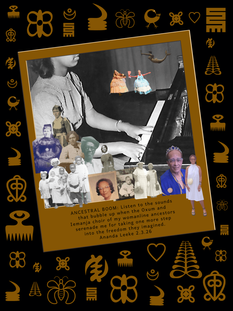 My collage celebrates what the ancestral boom sounds and looks like in my life. It features Ghanaian Adinkra symbols, black and white family photos of ancestors on my mom Theresa’s side, photos of two dancers from Balé Folclórico da Bahia’s performance honoring Yemanya, the goddess of the ocean and motherhood, and Oshun, the goddess of sweet waters, love, and beauty. It also features a photo of the Iemanja sculpture in Rio Vermelho, my favorite neighborhood in Salvador da Bahia, Brazil. Here’s a fun fact: the woman playing the piano is my mom Theresa when she was a young girl.