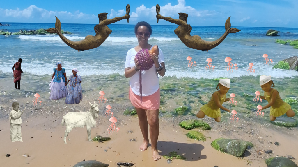I started the collage with a photo of myself playing the shekere, a West African percussion instrument made from a dried, hollowed-out gourd (calabash) covered in a woven net of beads, on a beach in Barra, a neighborhood in Salvador da Bahia. The photo was taken during my second Ancestral Spirits trip to Brazil in February 2025. Ancestral Spirits is a travel experience created and offered by Ronnell Perry, founder of AfroBuenaventura Transformative Travel.
