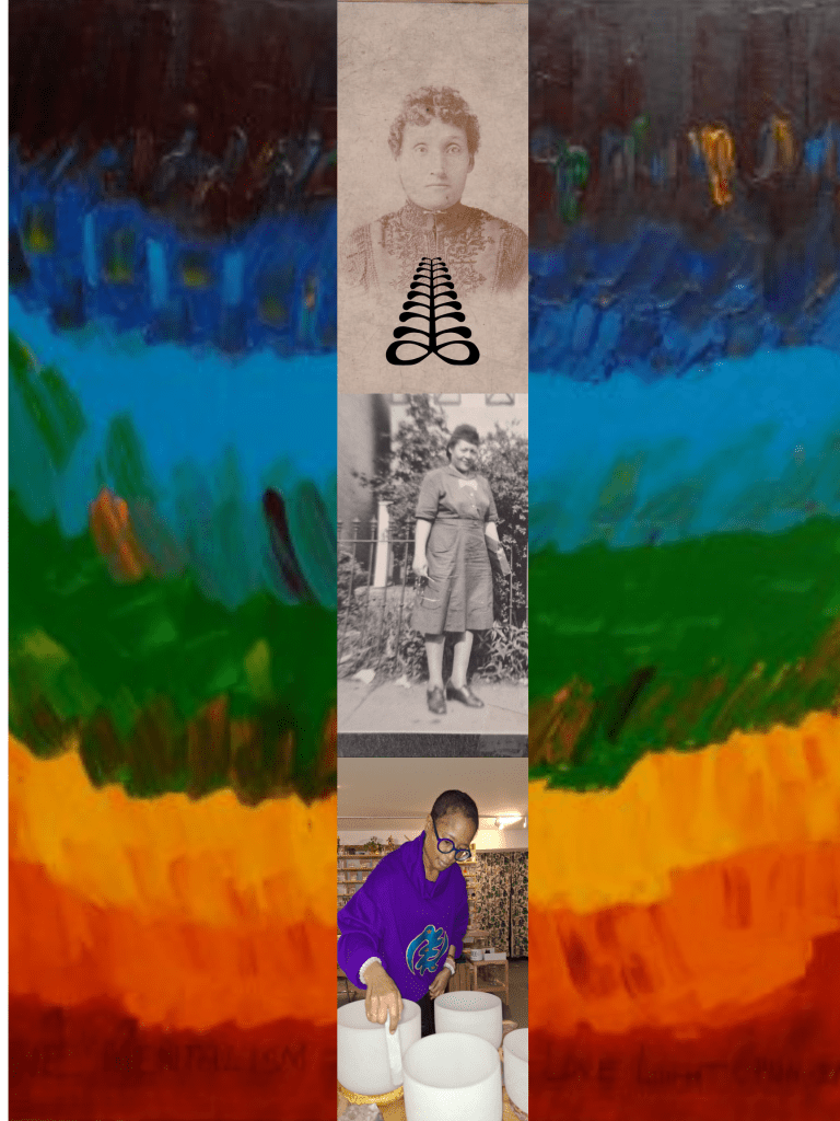 My collage is entitled “Womanline Healers.” It celebrates three generations of unique healers, including my great-great-grandmother Francis (Fannie) Daniel Thomas who shared her gifts as a midwife; my grandaunt Paulyne Roberts who served as a nurse at Freedman’s Hospital in Washington, D.C.; and me playing sound healing bowls. I placed an Aya Ghanaian Adinkra symbol on my great-great-grandmother Fannie’s chest. It represents healing.