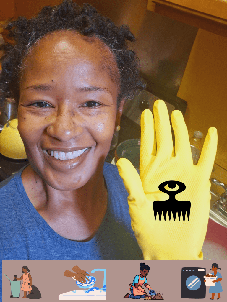 Cleaning is the first thing that comes to mind when I think about SOAP, the Februllage Day #21. My digital collage is entitled “Ms. Clean.” I started with a photo I took last year as I cleaned my kitchen and added graphics that illustrate my cleaning routine. I placed a duafe, the Ghanaian Adinkra symbol that represents cleanliness, on my yellow glove.