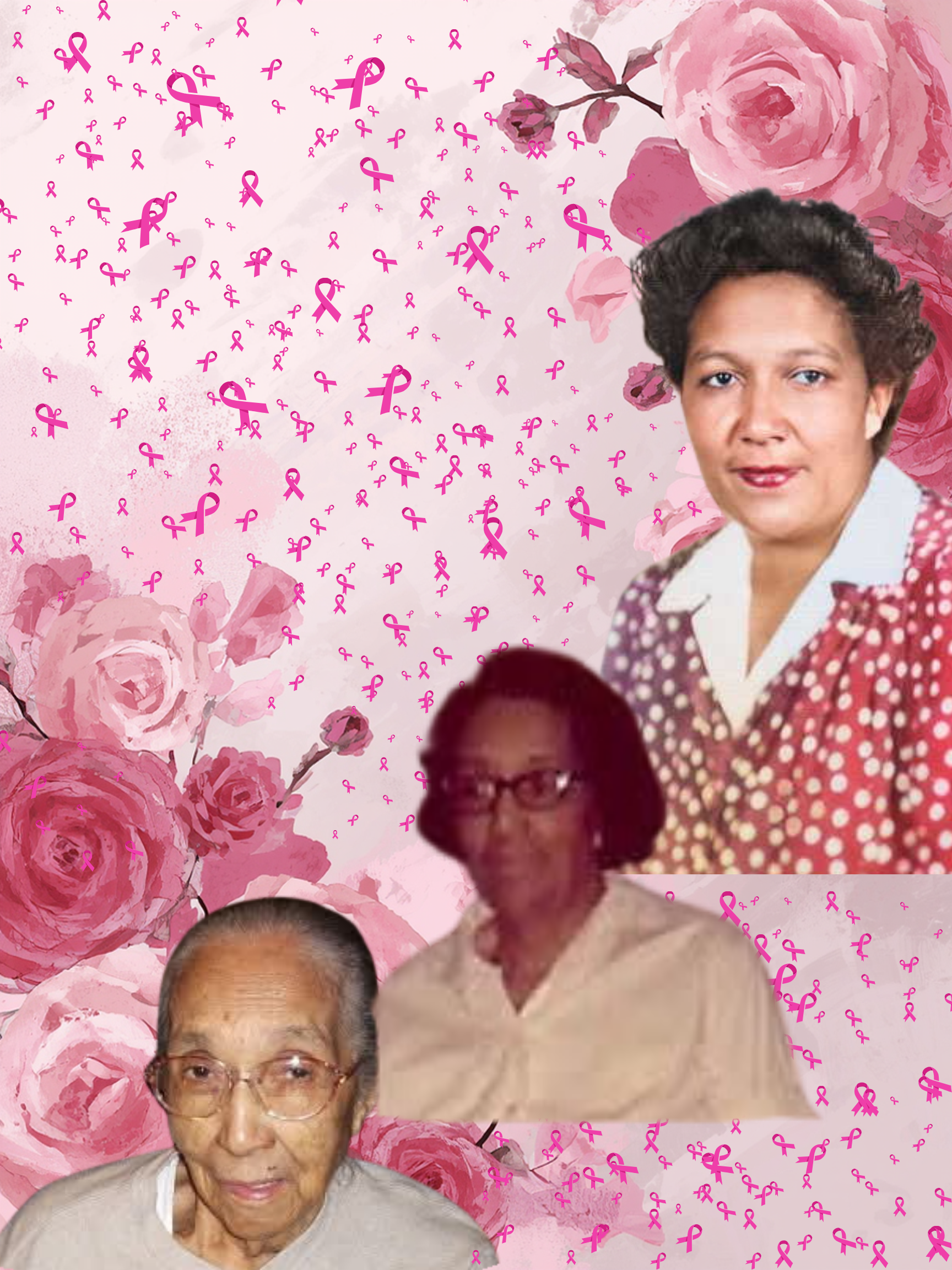 I used Canva to create an AI-generated background of pink roses, one of Nanan’s favorite flowers. She gave my mom Theresa some of her pink rose bush to replant in the yard of our home in Landover, Maryland. Breast cancer awareness ribbons are also included with photos of my grandmothers. The first collage features Nanan. The second collage features Grandmommy.