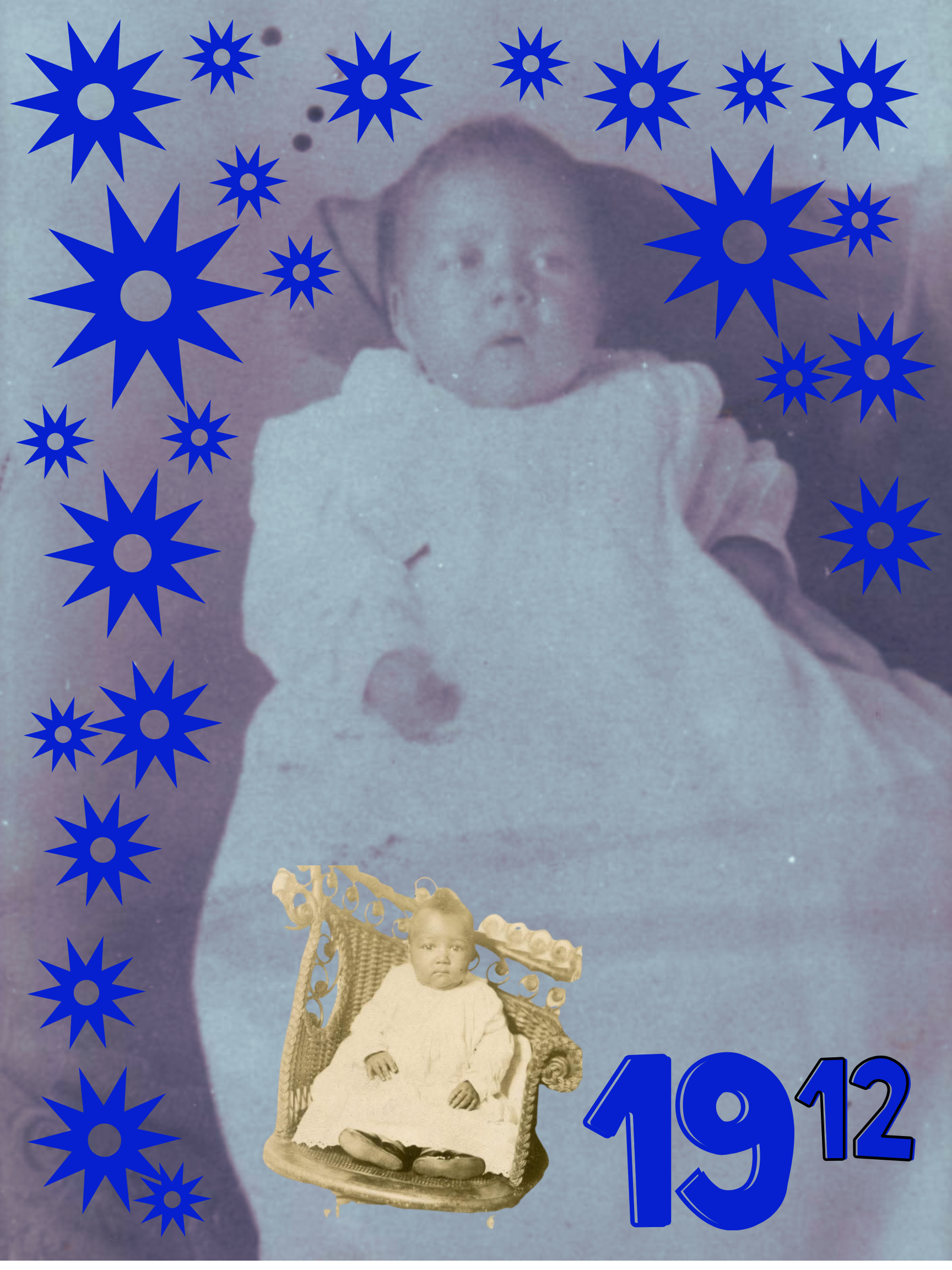 I started the collage with two baby photos of Nanan and used Canva’s “luna” filter to change the look of the larger photo. I used blue numbers to create 1912. Blue Nsoromma Adinkra symbols are included to affirm Creator’s love and protection of babies. Nsoromma means “child of the heavens.”