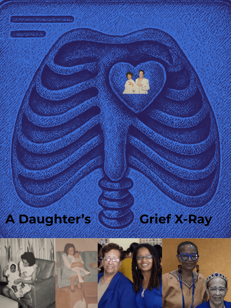 I used my grief to make a digital collage entitled “A Daughter’s Grief X-Ray.” It expresses my interpretation of x-ray, the Februllage Day #26 prompt. I found an x-ray graphic on Canva and created a blue background. I added a photo of my mom and I posing together with our Sigma Gamma Rho Sorority hand symbol during my parents’ 25th wedding anniversary in 1986 and placed it in my heart to remind myself that she is always with me. Four of my favorite photos of us are added at the bottom of the collage.