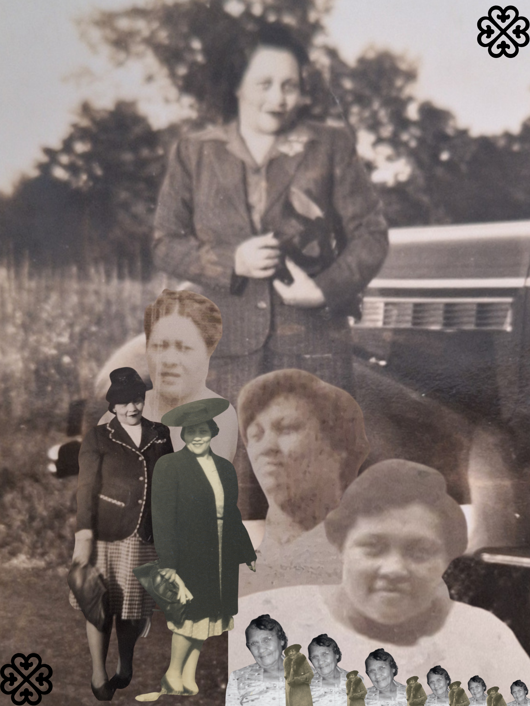 Today, I created a collage dedicated to my grandaunt Mabel’s journey from teenage womanhood to adult womanhood. I used photos of Aunt Mabel’s teenage years to thirties. Two photos of her mother Eunice Ann are added. I decided to create several copies as a border on one of Mabel’s teenage photos.