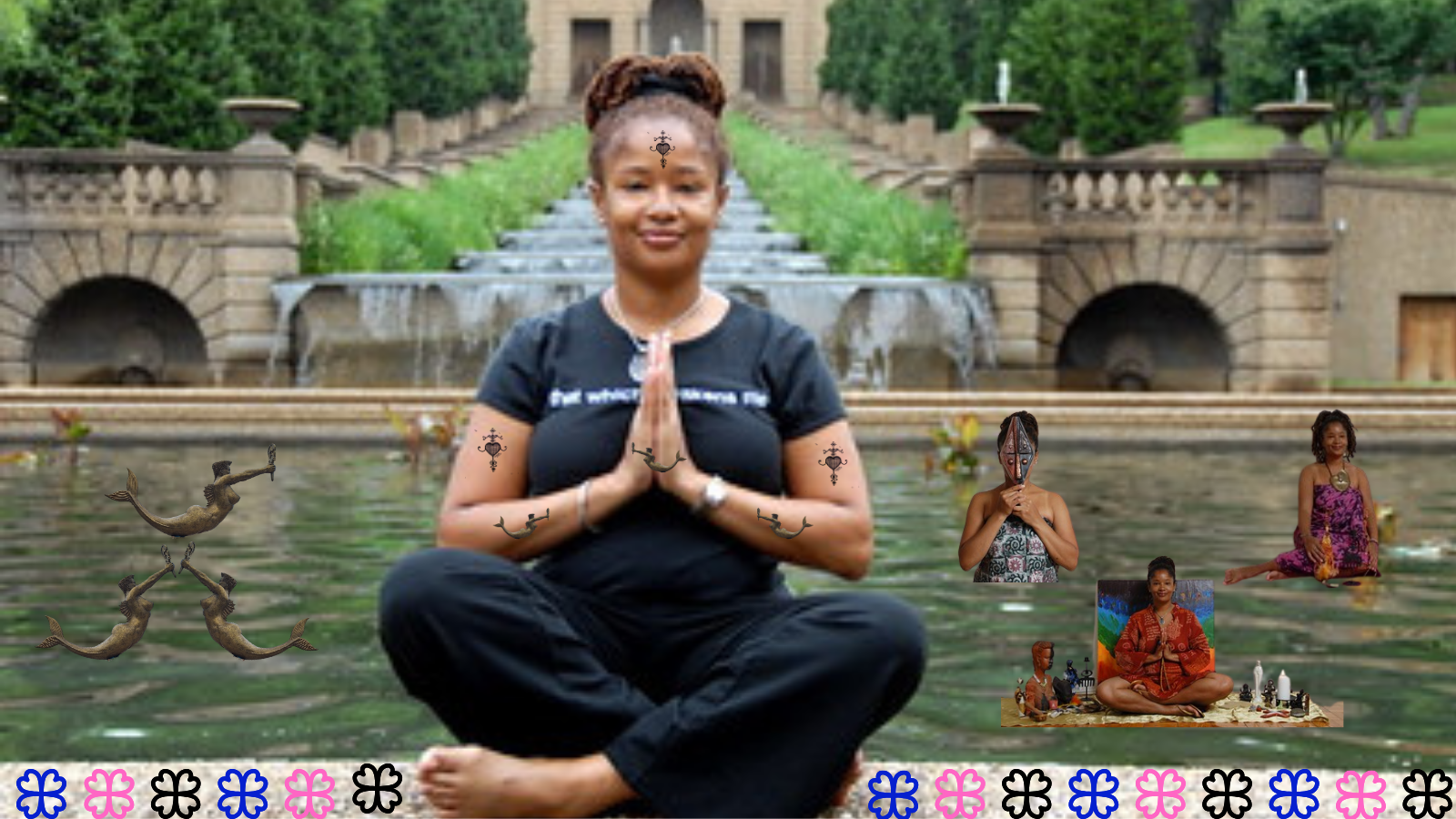The concept of the trinity is illustrated in three Erzulie Freda veves and Iemanja sculptures that appear on my body and in the water. It is also featured in the photos of my three archetypes: Ancestor – Wise Woman (holding a mask sculpture and wearing Ghanaian Adinkra green and purple cloth purchased during my 2003 trip to Ghana); Ananda – Spirit Woman Archetype (seated with an altar and my “Love Mentalism: Be Love, Love Light, and Live As the Spirit of Life” painting); and Kiamsha – Creative Woman Archetype (holding my Oshun wire sculpture made in 2000 and seated in purple and pink cloth purchased during my 2003 trip to Ghana).