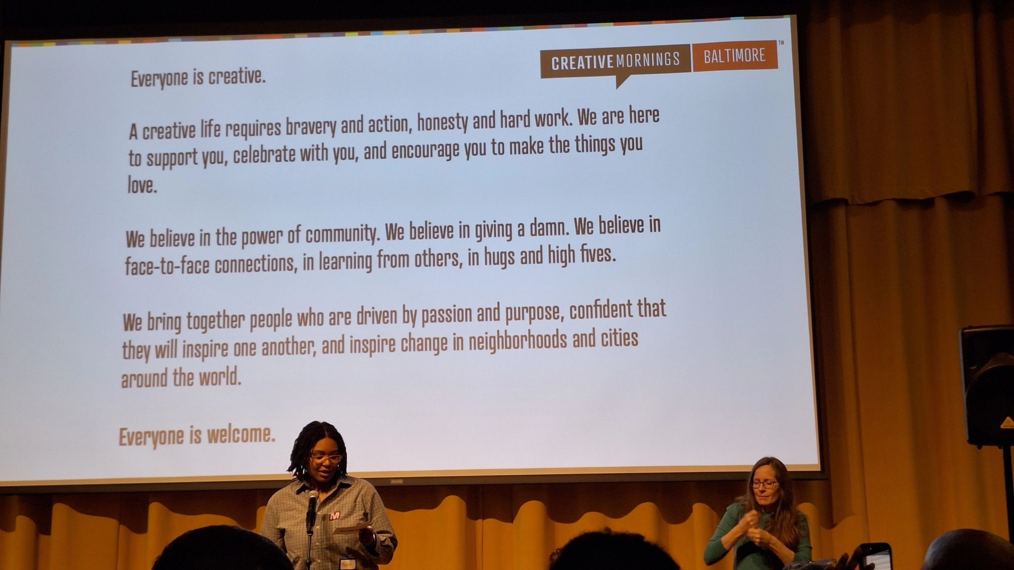 This year I decided to spend time with the Creative Mornings Baltimore community. Last Friday, I attended my first gathering at the Maryland Center for History and Culture with my soul sistalove Ayesha. As soon as we walked in and talked to the volunteers, I could feel the groovy vibes. The conversations I had with the diverse folks made me feel at home. The golden nuggets I received from the four speakers who shared their thoughts about the meaning of local were just the medicine I needed. All of it fed my soul in a deep and meaningful way. I’ll definitely be back next month! Visit https://creativemornings.com/cities/bal to learn more about the community.
