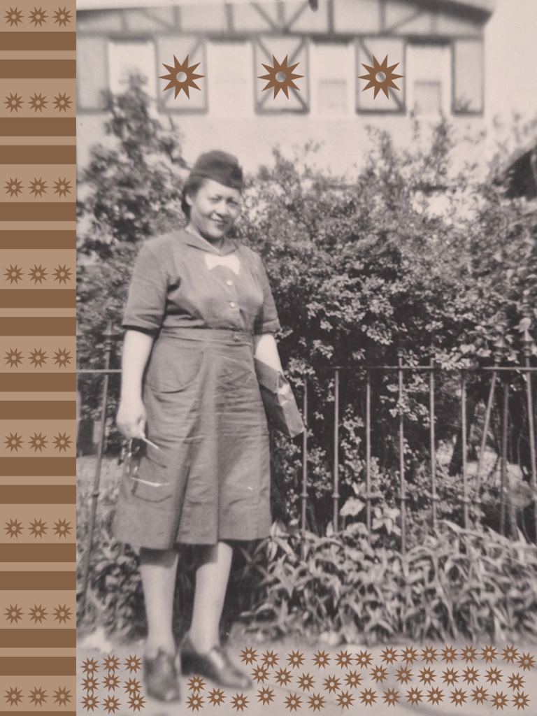 The photo I used for the base of my collage features my Aunt Paulyne Roberts who worked as a public health nurse at Freedman’s Hospital in the 1940s in DC. She is standing on a street in DC. I added my Chocolate City flag as a border on the right side of the photo and placed Nsoromma symbols on windows and the sidewalk.