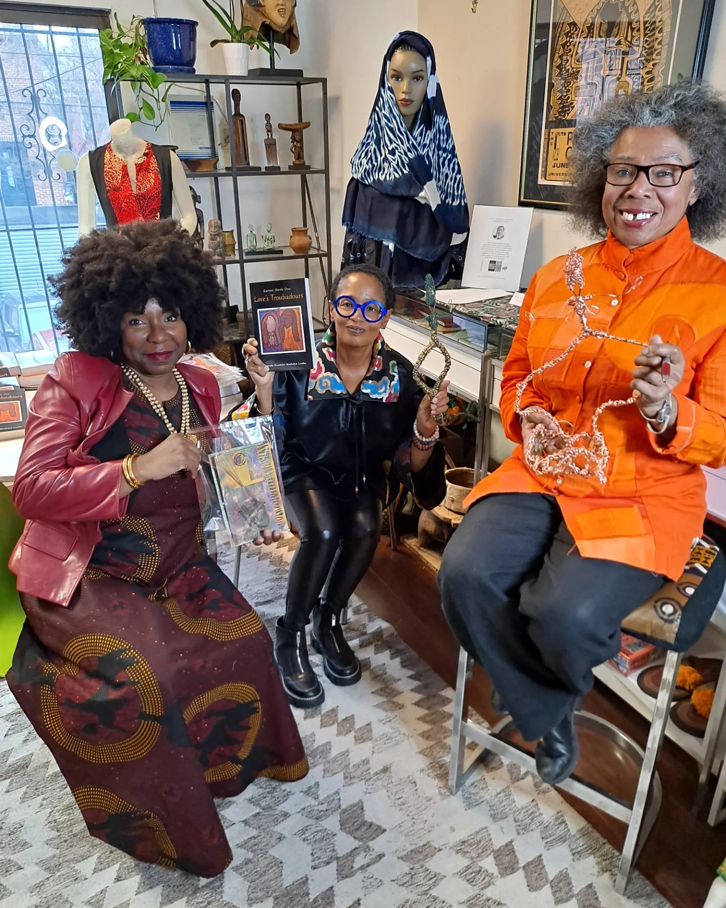 In 1995, I debuted my “Divine Divas” wire sculptures, transforming coat hangers and everyday objects into symbols of beauty and resilience. My work has been exhibited in Los Angeles, California, New York City, Washington, D.C., and beyond, and featured in Heart and Soul Magazine. I also create art inspired by African spirituality and healing traditions, showcased in my books, scarves, galleries, and public collections. (see below).