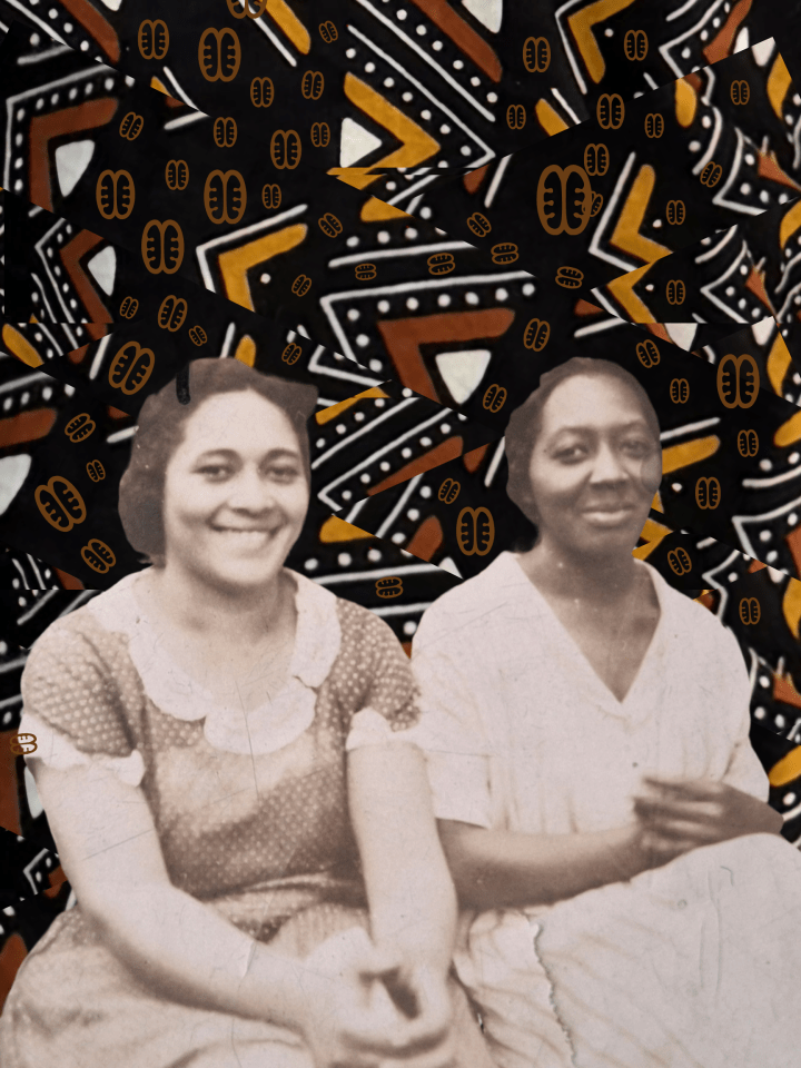 I placed a photo of Aunt Paul and her bestie Cleo that was taken in 1918 or 1919 on top of the fabric photo. I removed the photo’s original background on Canva. I added brown Ese Ne Tekrema symbols to the fabric. Ese Ne Tekrema is a Ghanaian Adinkra symbol that represents friendship and cooperation.
