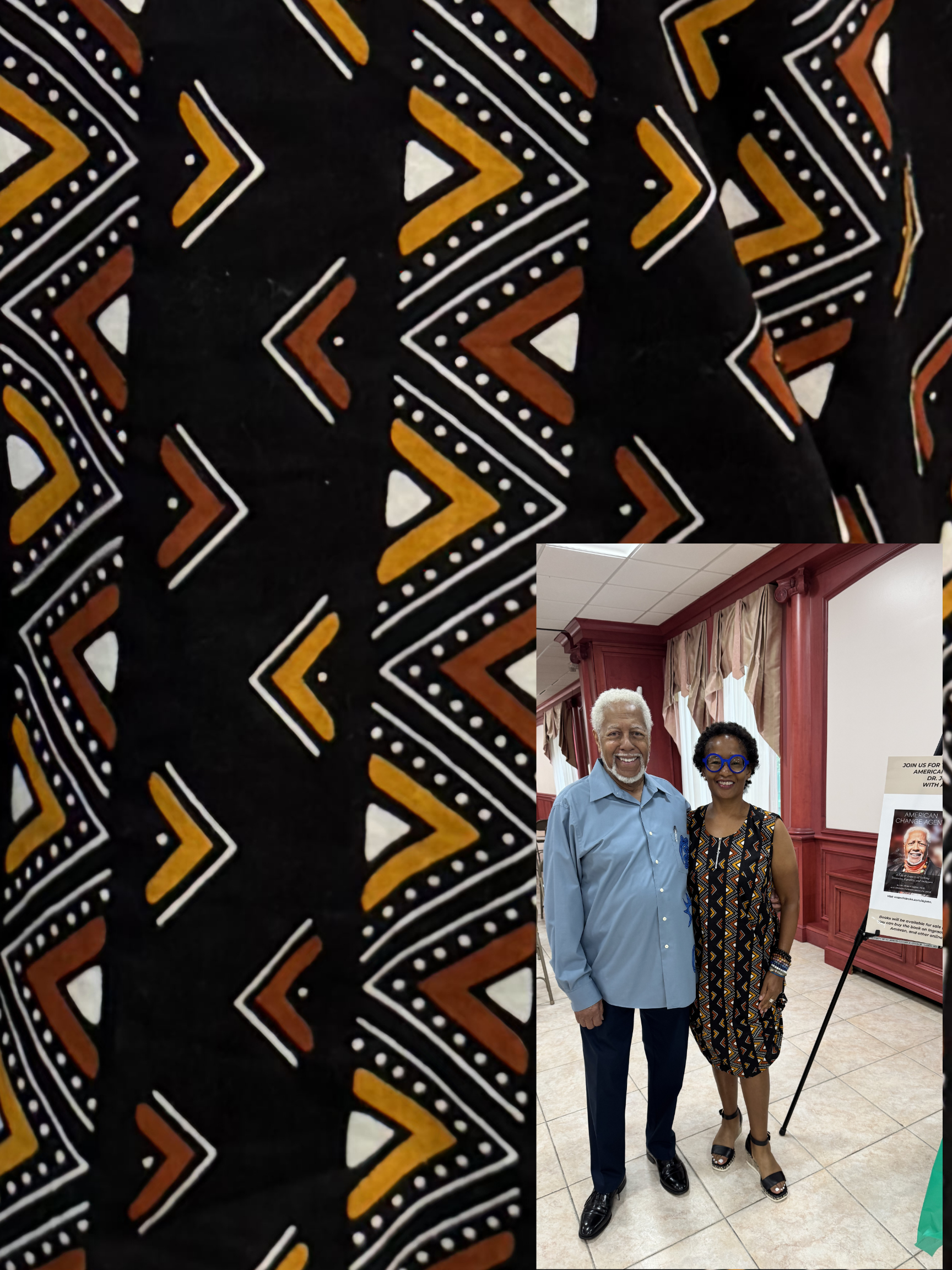 I used two 1940s photos of Aunt Mabel. One photo is from her career as a teacher in Elkhart, Indiana. They second photo features Aunt Mabel and a group of women that she is connected to. I imagine that the women are probably her Zeta Phi Beta Sorority sisters. I added brown Ghanaian Adinkra symbols called Duafe and Nea Ope Se Obedi Hene to the fabric to celebrate the beauty, femininity, sisterhood, and commitment to service.