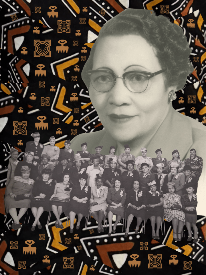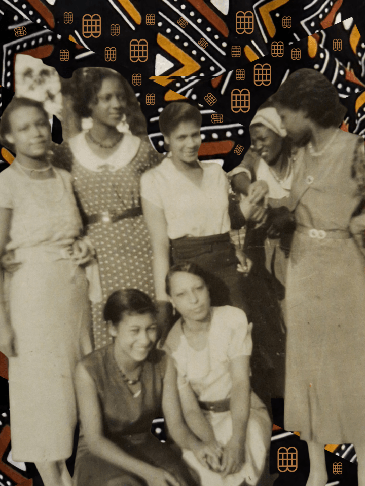 The collage celebrates the relationships Grandmommy had with her girlfriends. I used Canva’s background remover tool to recreate the image of the 1933 photo of my grandmother and her girlfriends. I imagine they were posing for a photo at one of their AQ Club meetings, teas, or events. My grandmother is the young woman kneeling in a dark colored dress. She was 18 when the photo was taken and a freshman in college. Brown Nnamfo Pa Baanu Ghanaian Adinkra symbols were added to the collage because they symbolize friendship and fellowship, two key ingredients in my grandmother’s life.