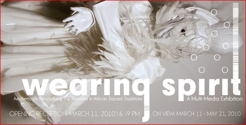 “Wearing Spirit” is a multi-media exhibition of paintings, sculpture, photography, textile art, video and installations honoring the power of the sacred feminine in African spiritual traditions. When I walked into the gallery, I felt a powerful energy wash over my spirit and ‘heart as I took in the beauty of each piece of artwork. AMAZING! Each artist”s work touched me deeply. I felt the presence of my ancestors in their work.