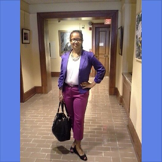 This week, I facilitated a nonprofit digital storytelling workshop for my client, Serve DC’s National Service Program Director Institute. I wore bright colors: purple Ann Taylor Loft pants and white t-shirt, blue Dress Barn blazer, H&M gold necklace, Forever 21 gold bangles and ring, and Anne Klein black peek-a-boo wedge shoes. My vegan black bowling bag from Violet Boutique kept me company.