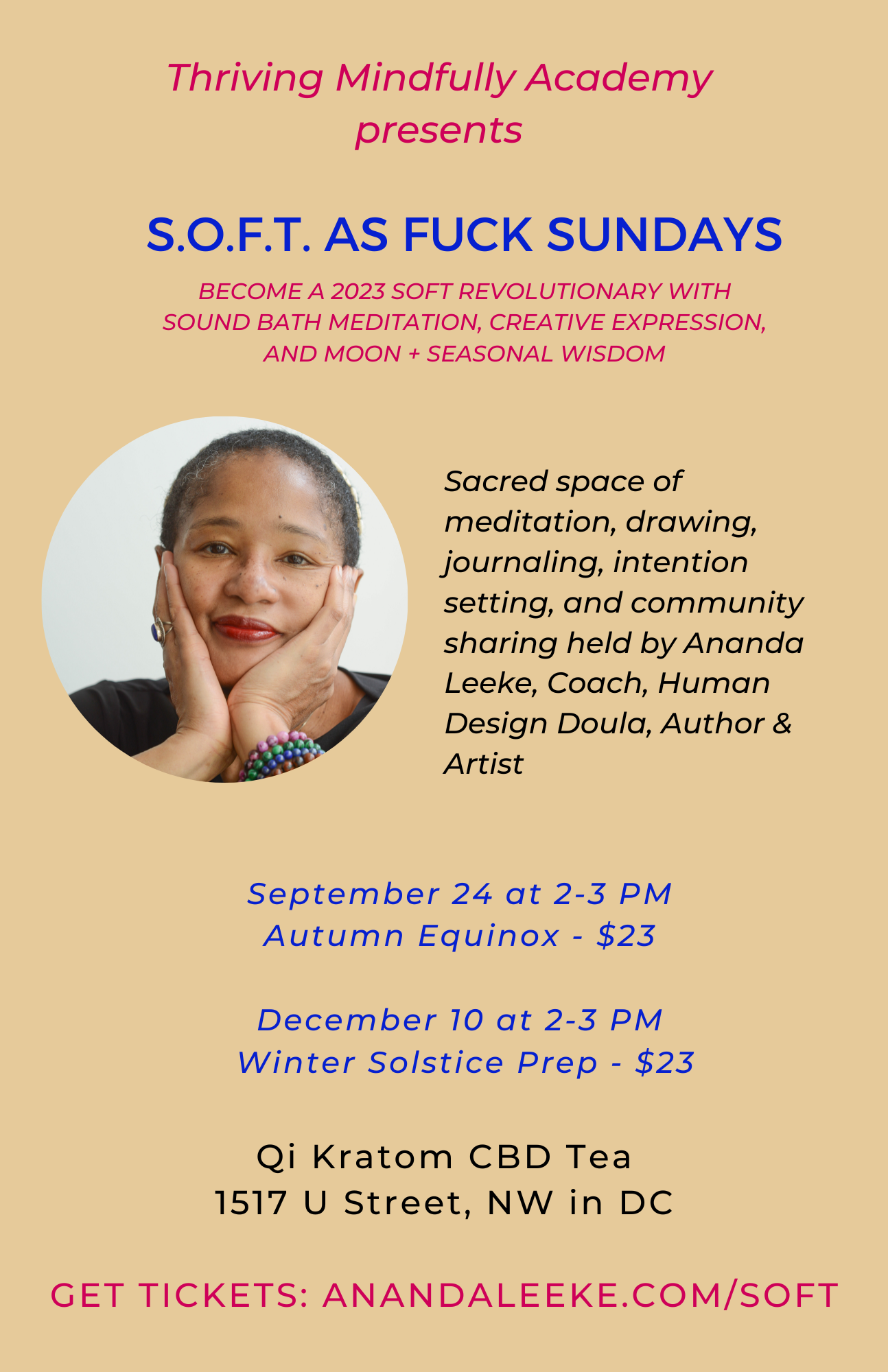 That’s why I am hosting S.O.F.T. AF Sunday on September 24th to welcome the Autumn Equinox and December 10th to prepare for the Winter Solstice.