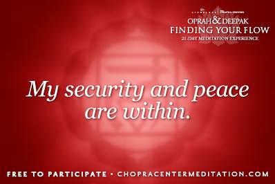 The theme for Day #1 of the Meditation Experience is “Finding Security.” While standing in the Mountain or Tadasana pose, I used today’s affirmation as a mantra: “My security and peace are within.” It stayed with me all day!